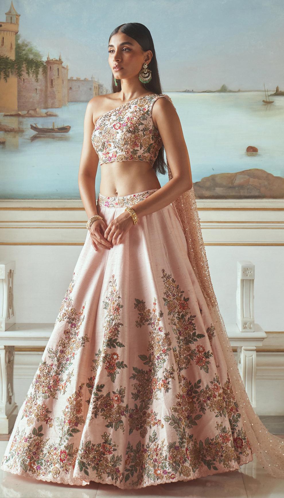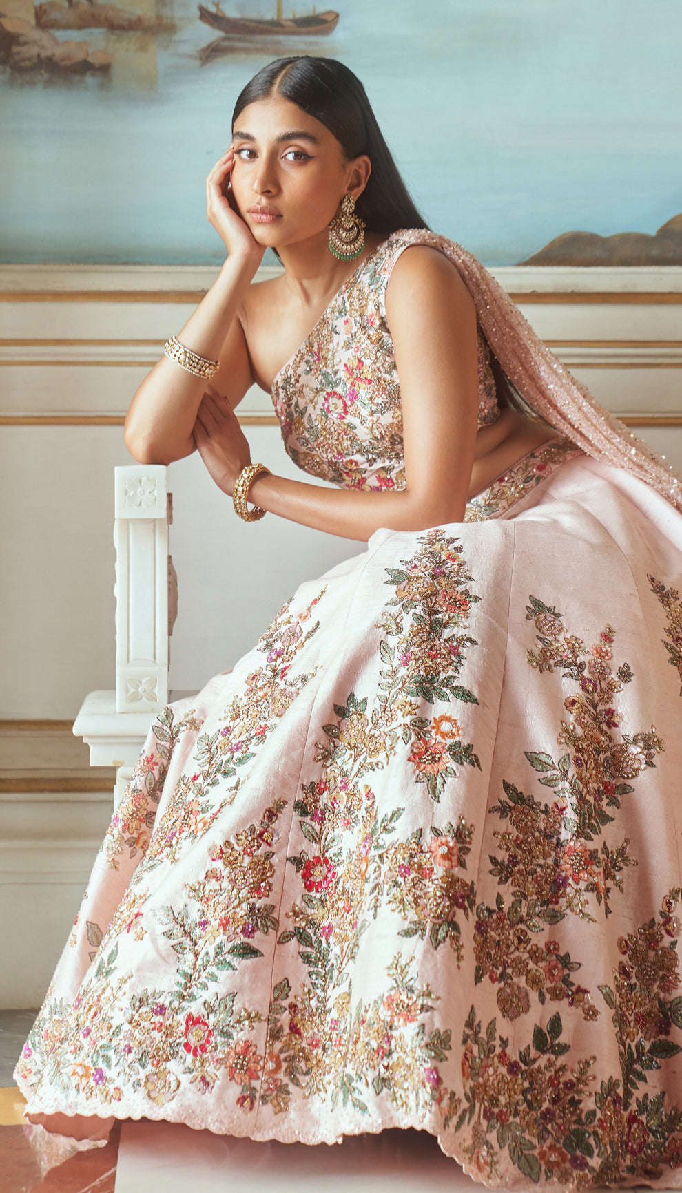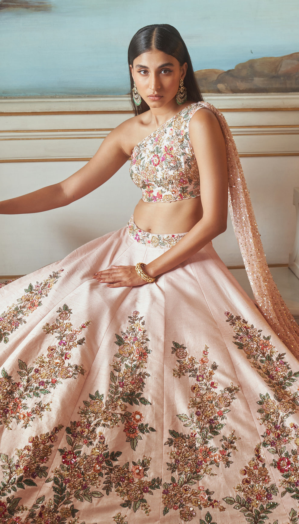 A blush pink raw silk lehenga with floral bouquets delicately embroidered with shimmer sequins and glass beads and accents of rose gold zardozi. This is paired with a one shoulder blouse and trailing tulle dupatta with an elaborately embellished pallu.