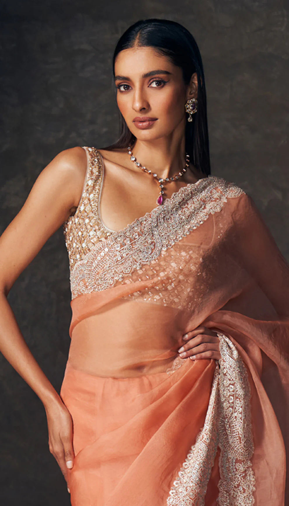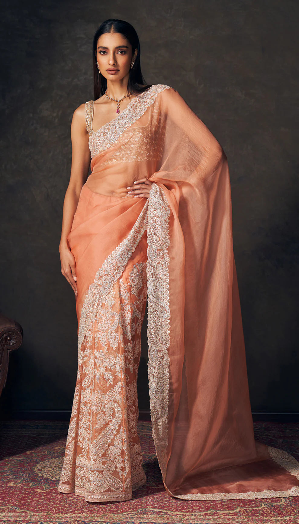 A peach organza saree with delicate paisley embroidery. This is teamed with Raw silk blouse.