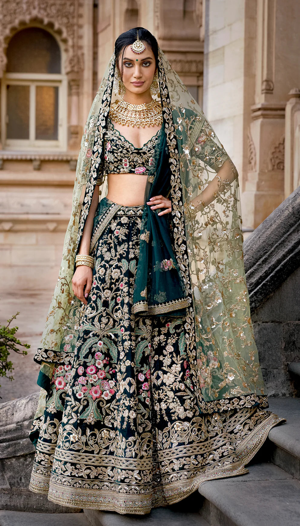 Rich Green Velvet Lehenga with Gilded Zardosi Jaal & Gujarat Haveli-Inspired Embroidery