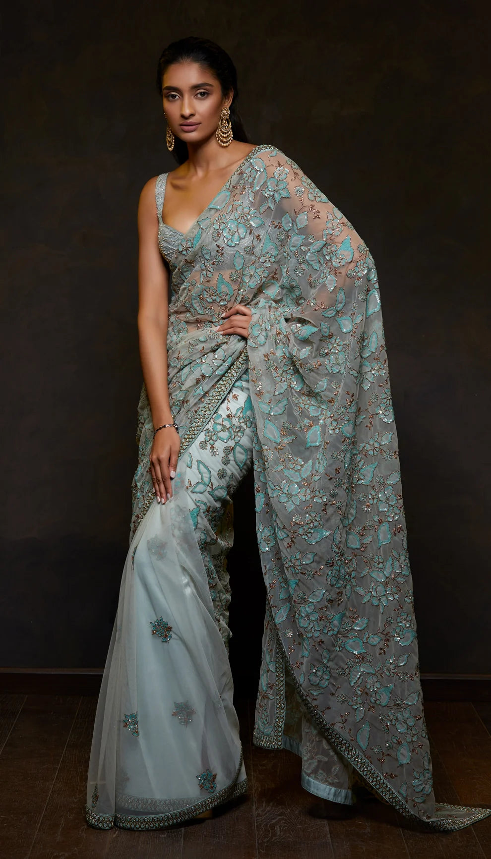 The flower cluster saree, a sublime tulle applique saree in monsoon sky blue color, paired with a tulle bustier.