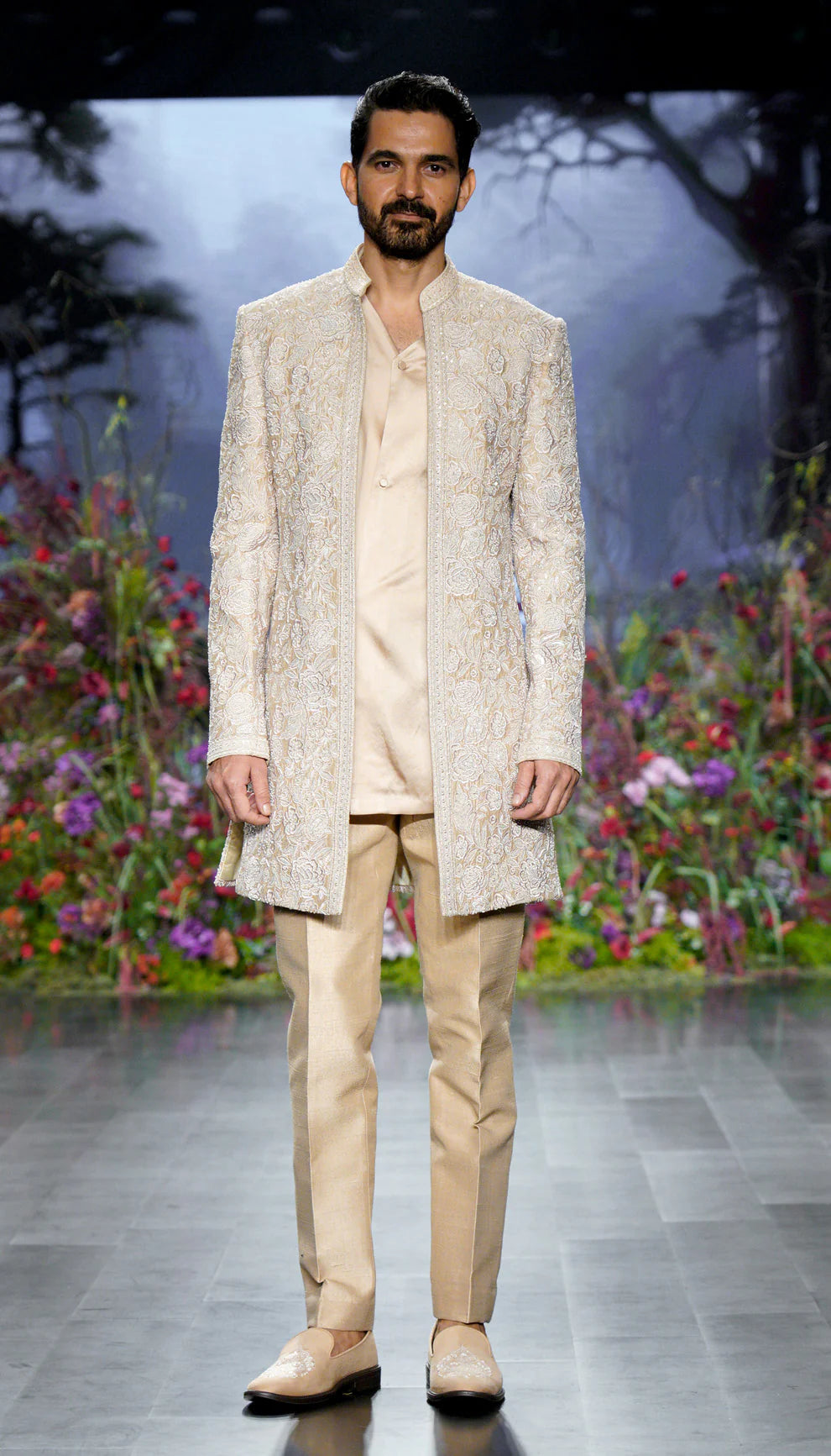 A parchment ivory men's jacket with opulent tone on tone embroidery. This is worn with a draped shirt and raw silk trousers.