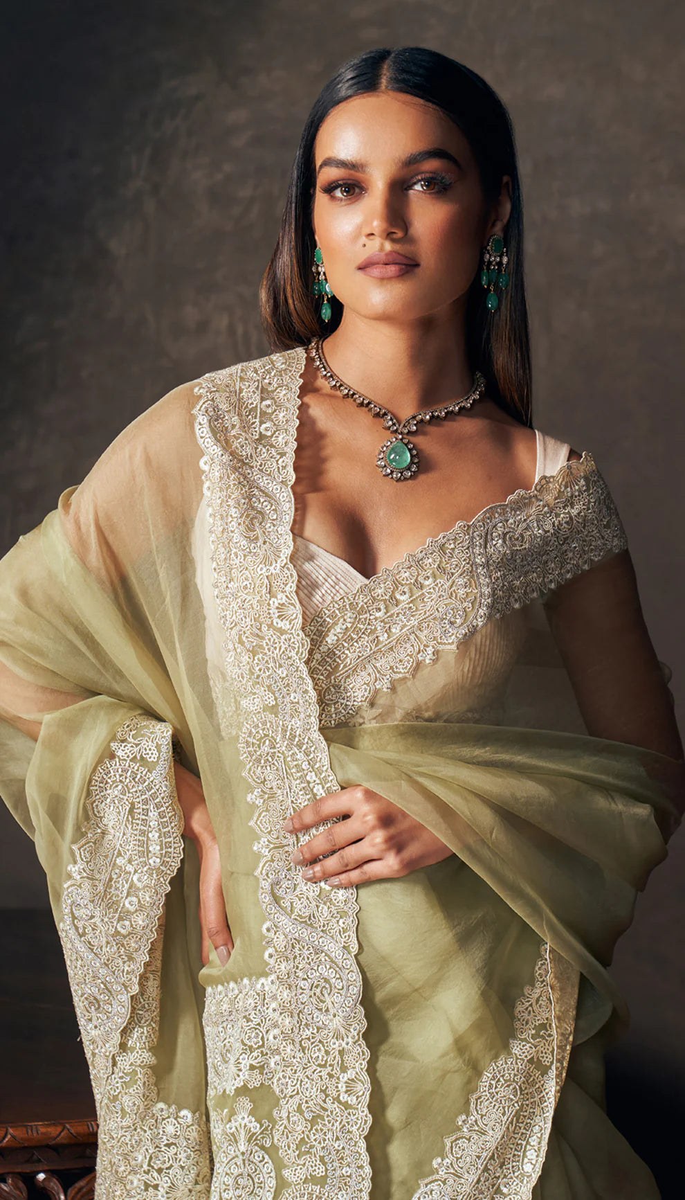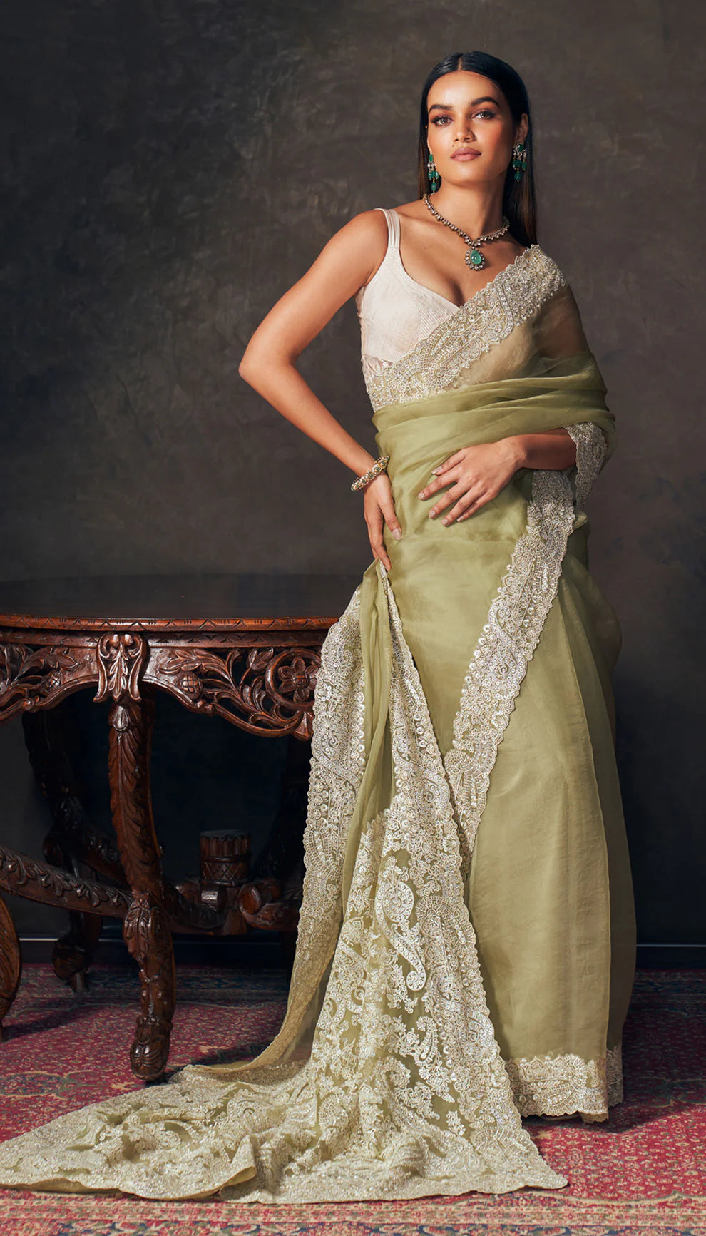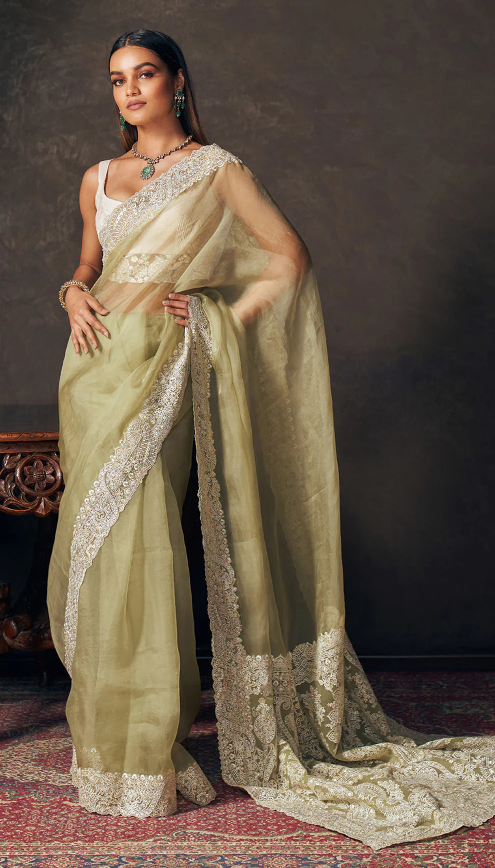 An olive green organza saree with a beautifully embroidered paisley border and pallu in intricate resham and zari. This is teamed with a raw silk blouse.
