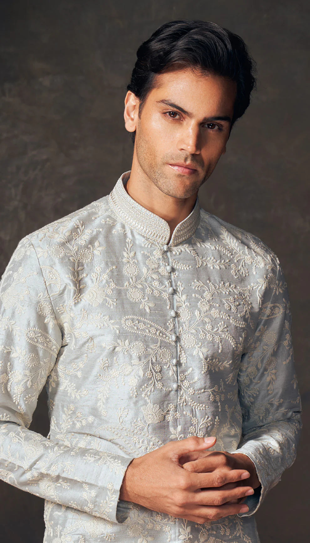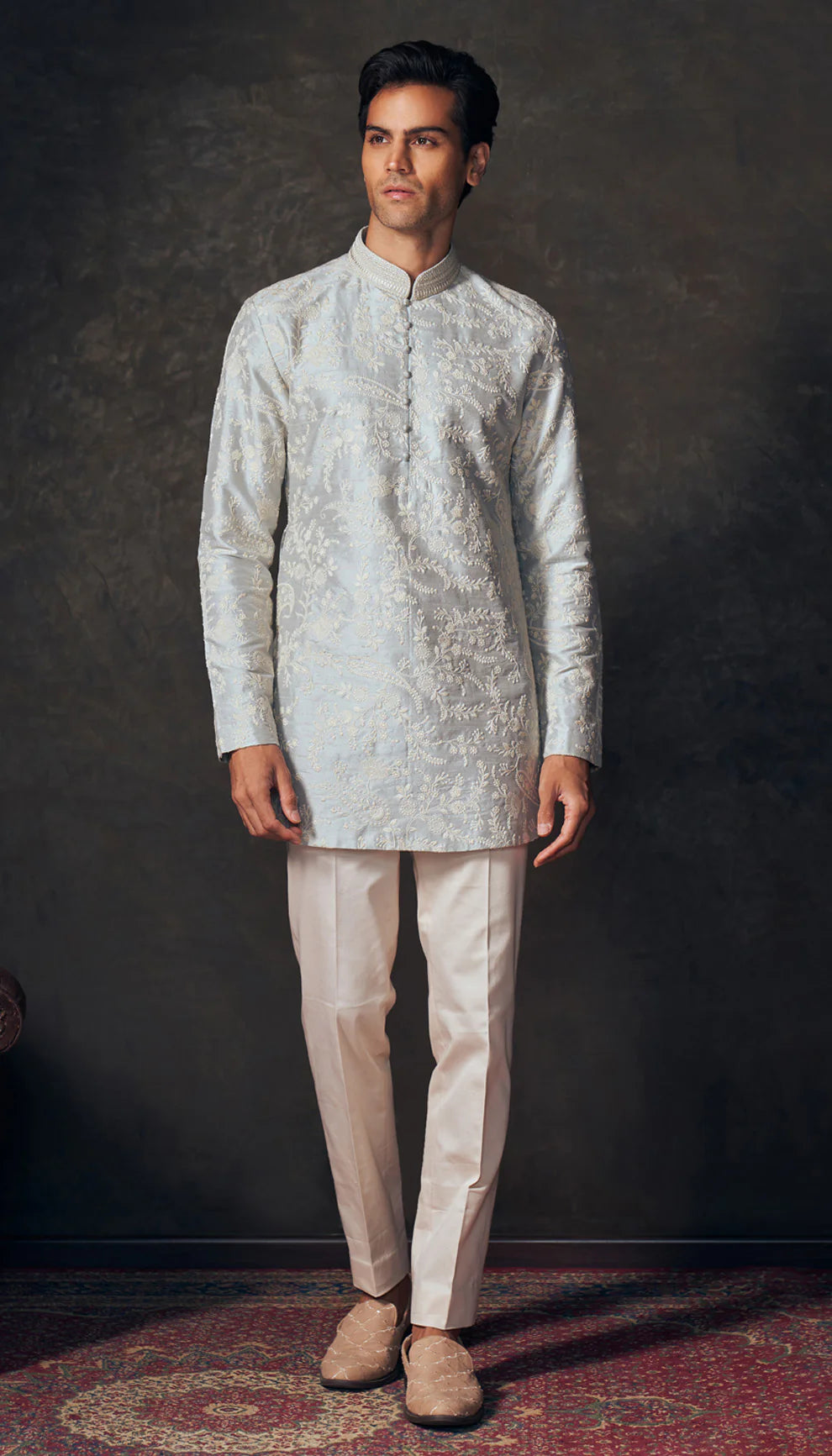 An ice blue raw silk kurta with floating paisley embroidery. This is teamed with a cream matka silk trousers.