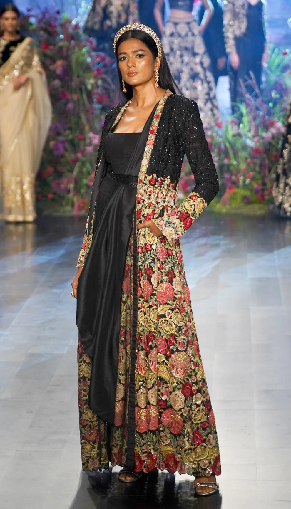 An ebony black tulle jacket with tropical blooms, delicately embroidered in contrasting colors and accentuated with glass beads, shimmer sequins and crystals.