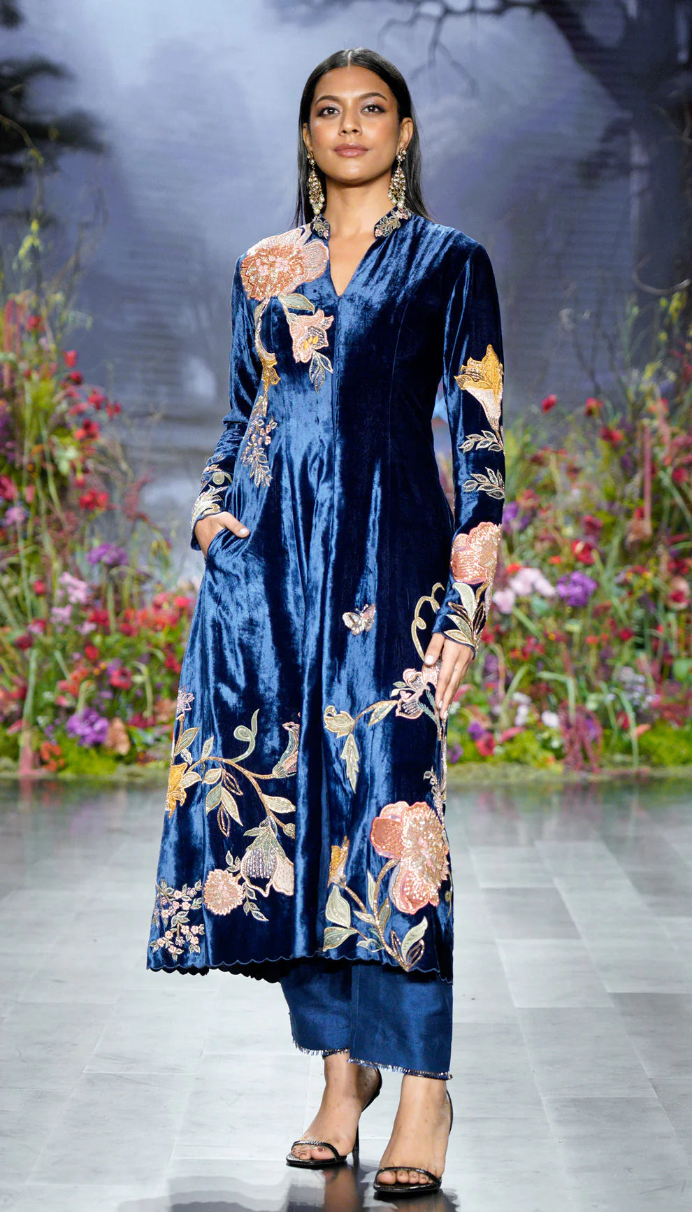 A persian blue silk velvet jacket with painterly florals embroidered in stricking contrast hues, enhanced with delicate rose gold zardozi and glass beads. This is worn with slim fit raw silk pants.
