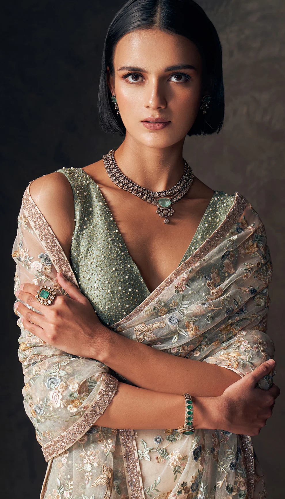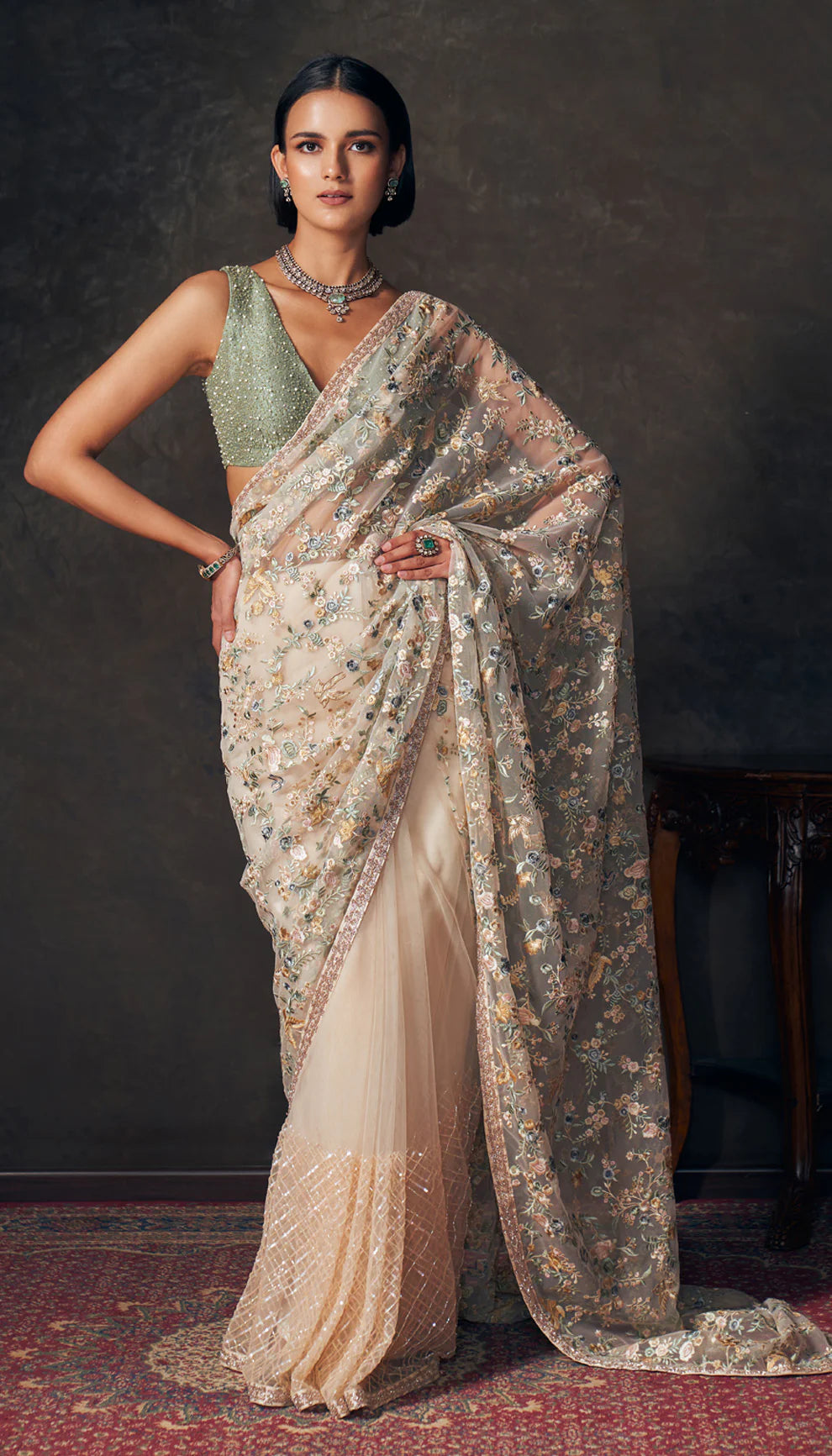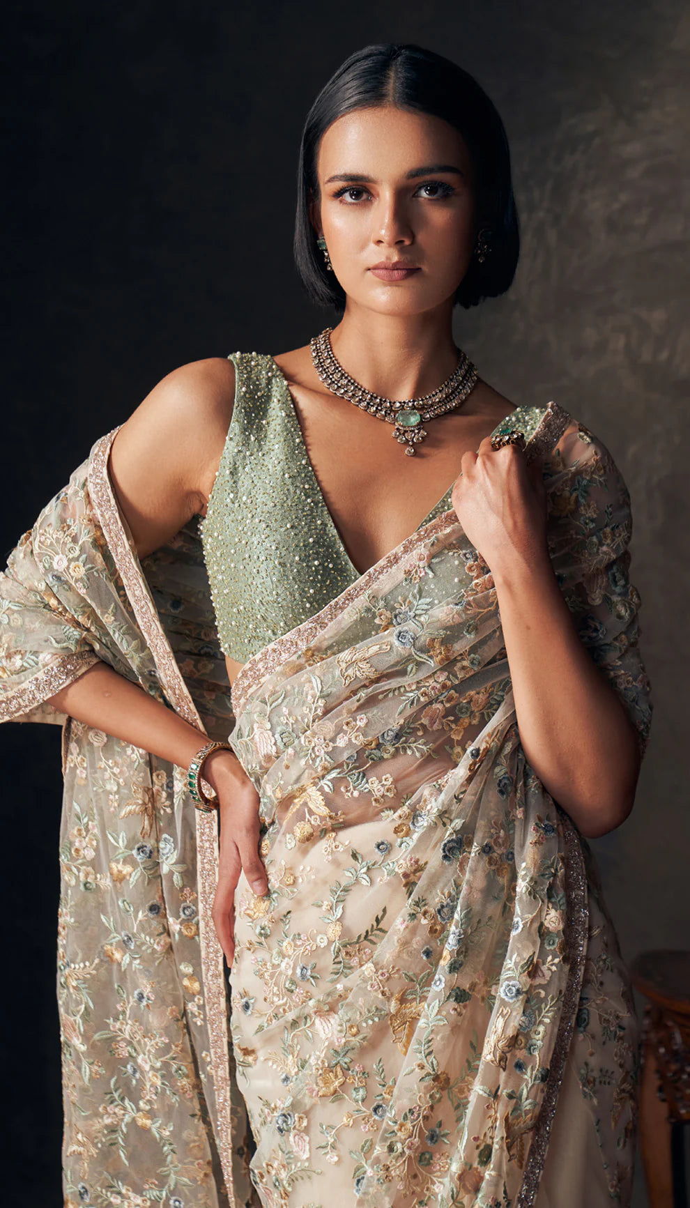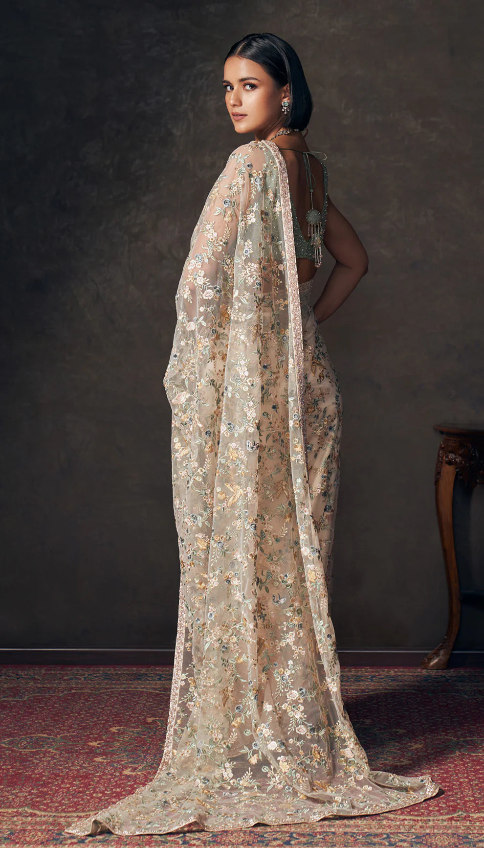 A shell pink tulle sari with delicate floral Resham embroidery. This is teamed with a sage green sequin embroidered blouse.