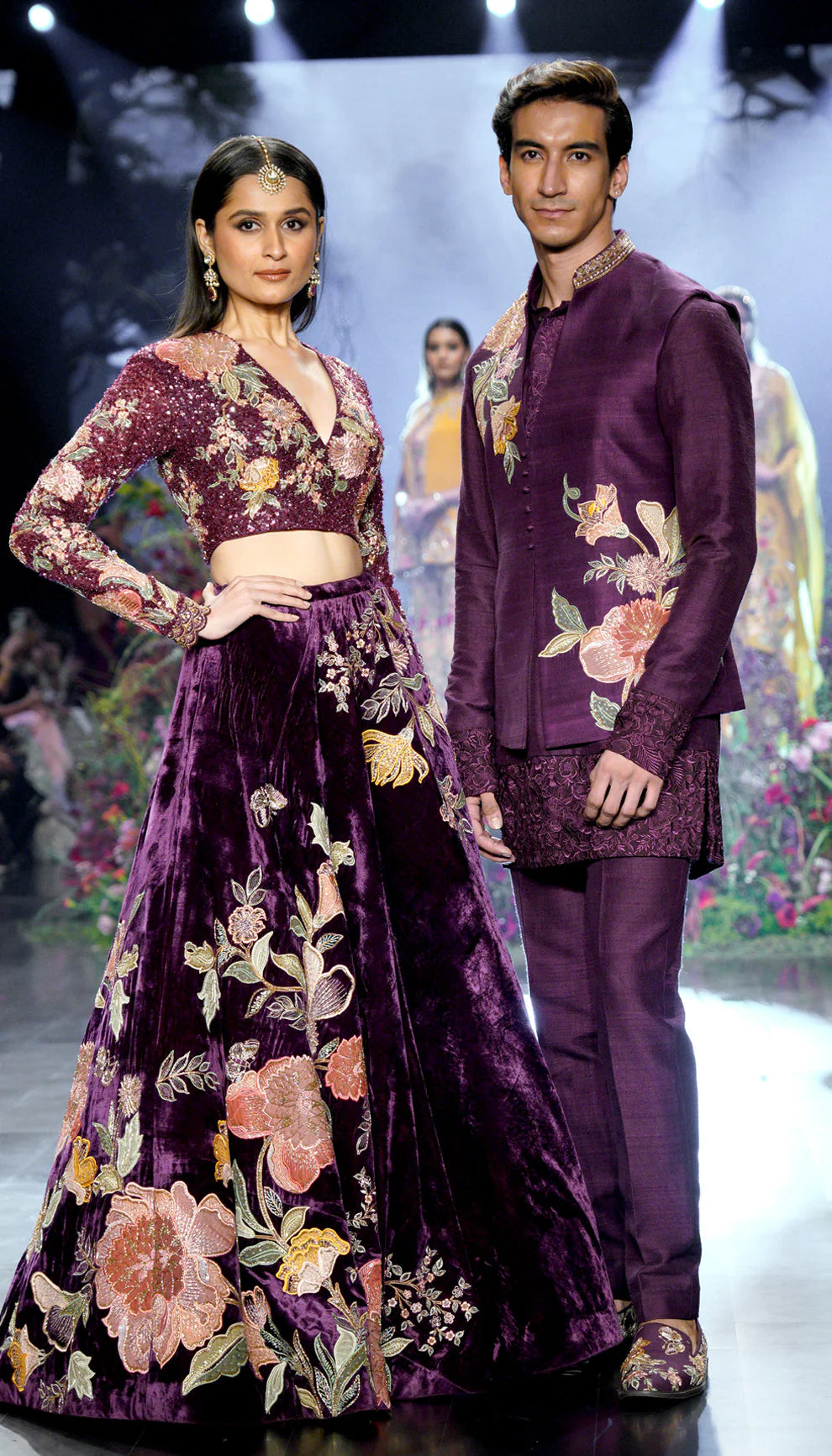 An aubergine silk velvet skirt with beautiful florals, embroidered in stricking contrast hues. This is enhanced with delicate rose gold zardozi & glass beads. A burst of realistic multicolored flowers with delicate stems has been placed on the panels. This is worn with a heavily embellished crop top & silk organza dupatta.
