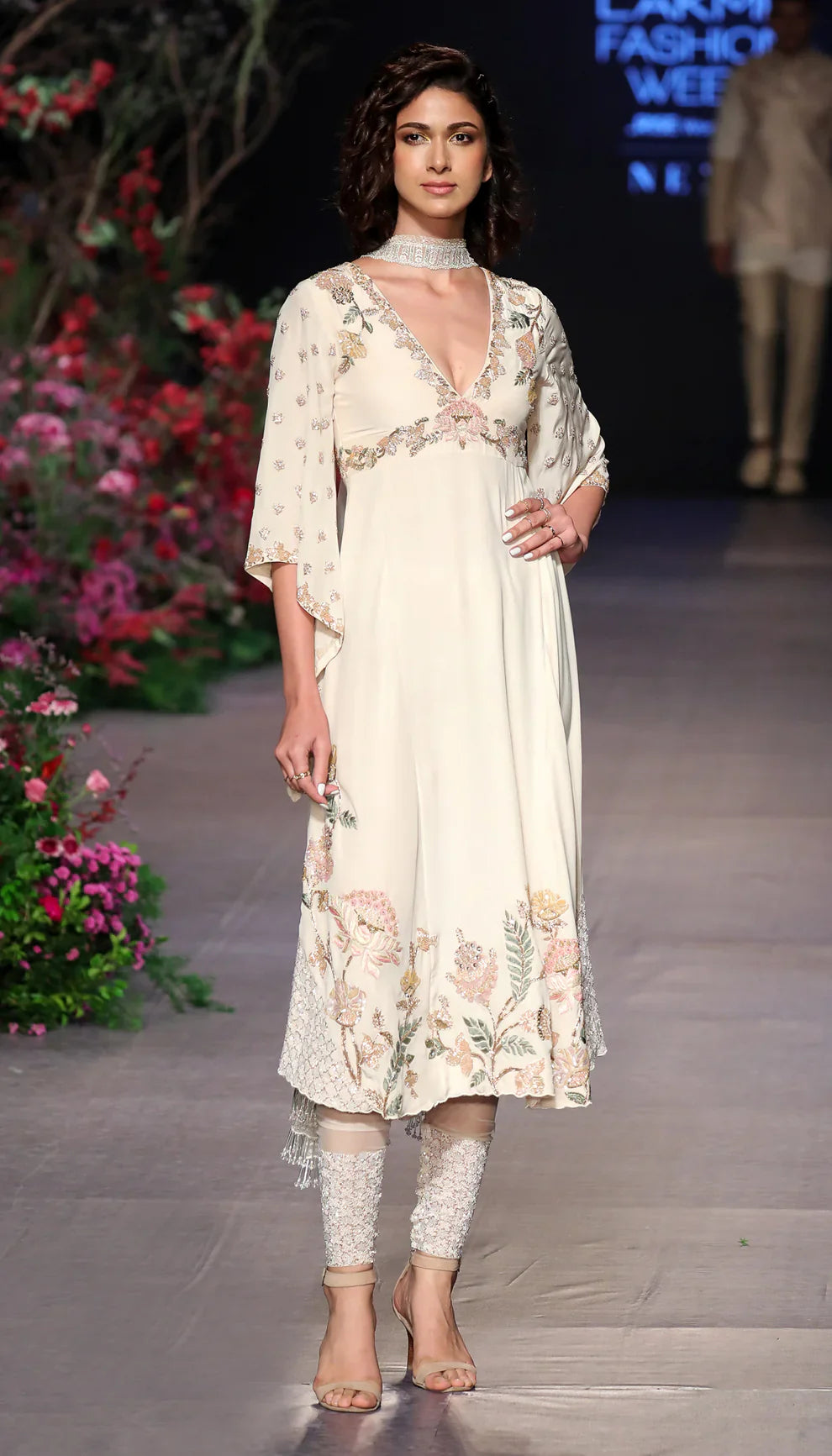 An ivory crepe silk kalidar dress with bell sleeves embroidered in dainty floral paired with a churidar and dupatta.