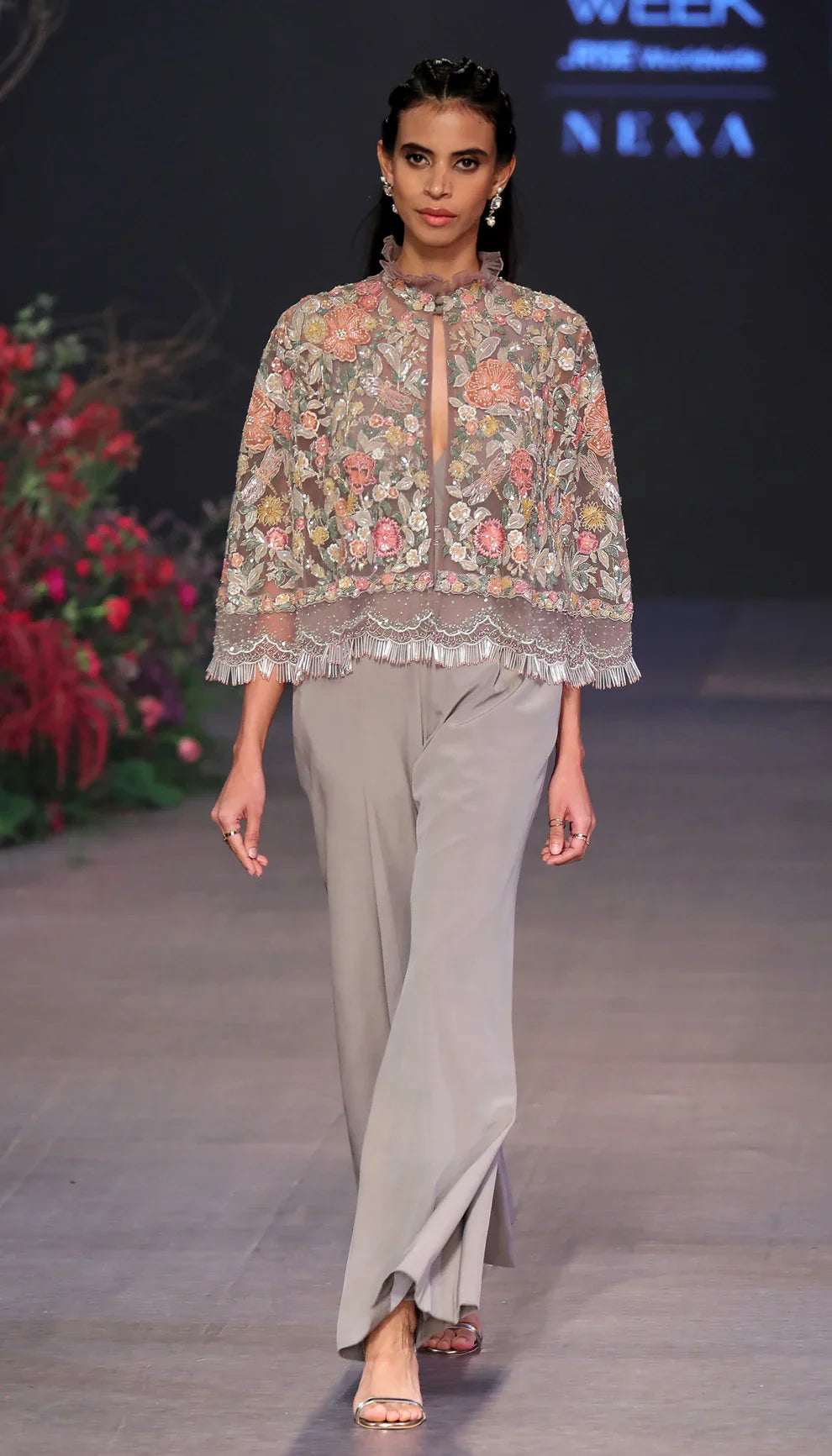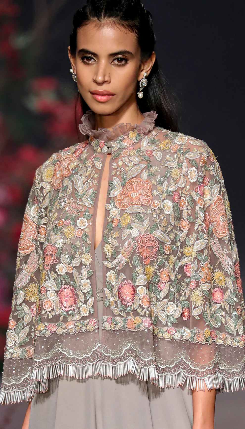 A moon-grey crepe silk jumpsuit, worn with a tulle cape embroidered in contrast resham and applique.
