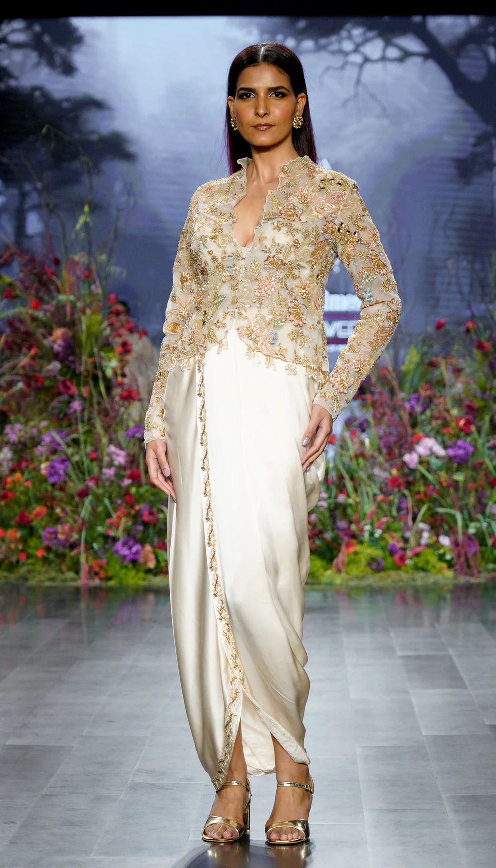 A parchment ivory draped dress in silk satin worn with a structured tulle jacket. This is embroidered with elaborate florals in contrasting hues and heavily embellished with gold zardozi, mirrors and glass beads.