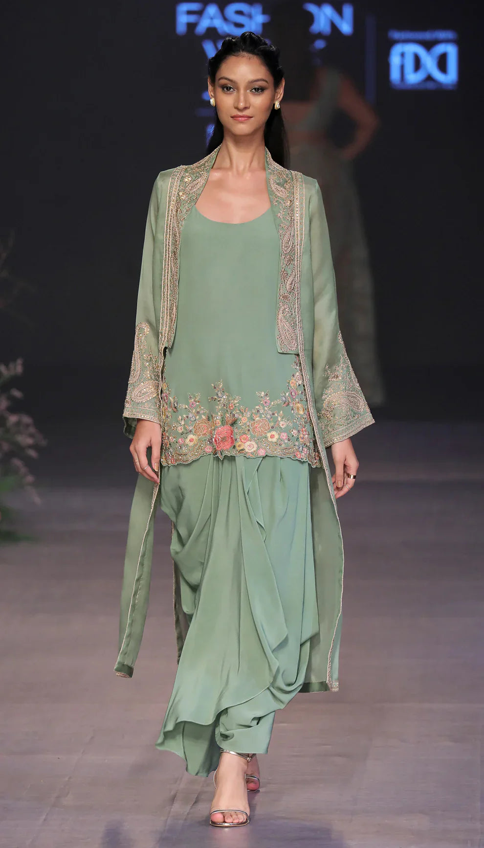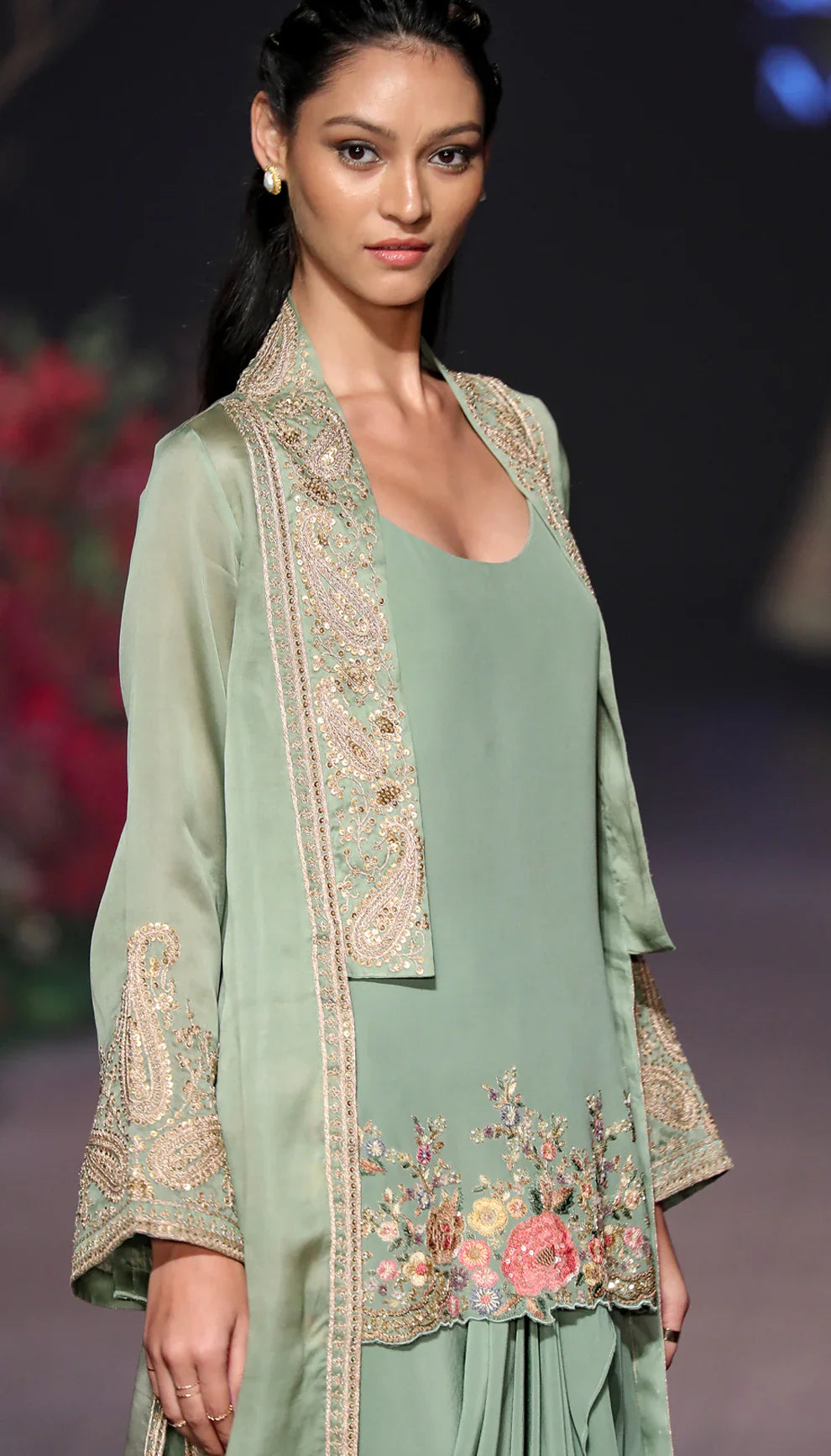 An Alluring Sage Green cowl pant set, with colorful floral embroidery on the top
