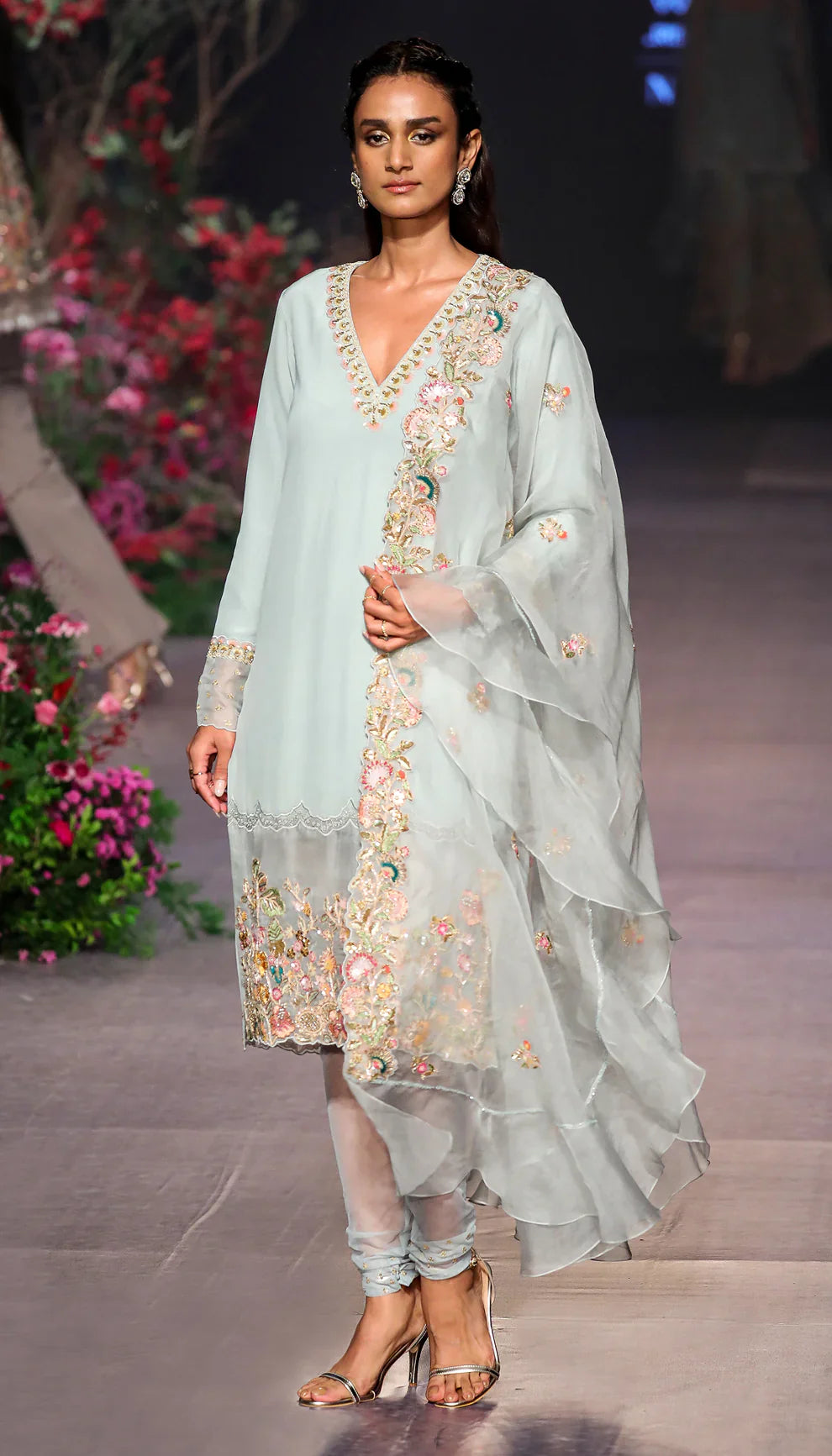 A powder blue straight fit dress with floral organza applique hem paired with an organza