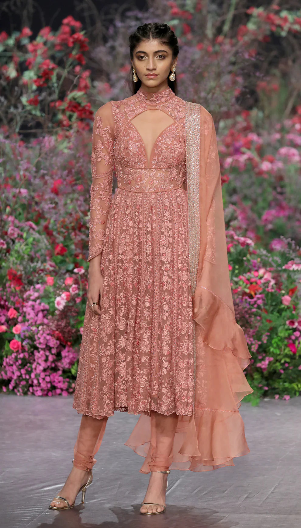 A salmon pink kalidar dress with dainty thread embroidery, paired with a tulle churidar and an organza dupatta.