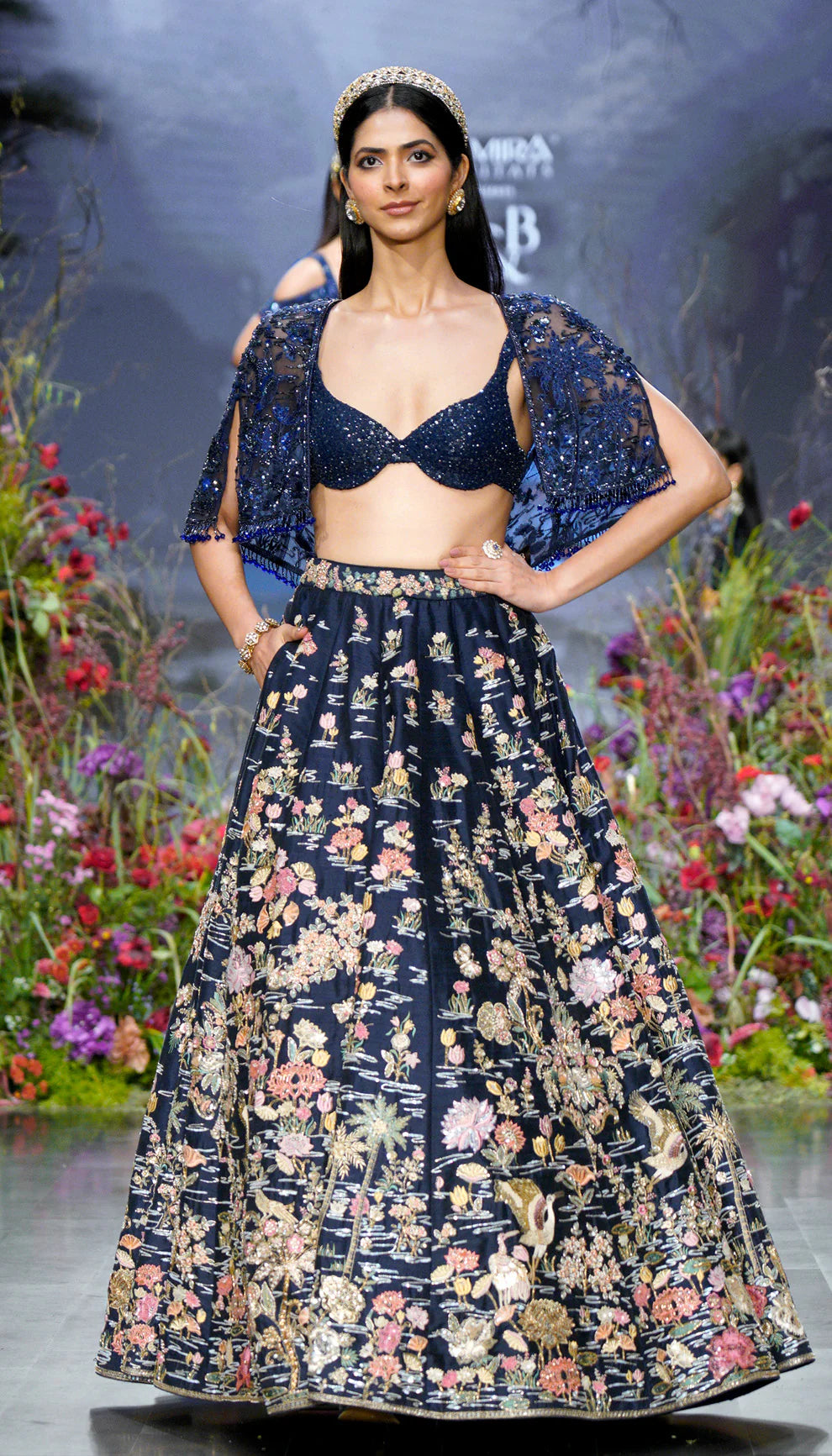 A midnight blue raw silk lehenga with picturesque scenes from nature in spring, embroidered beautifully on each panel. The contrast thread embroidery is accentuated with rose gold zardozi, shimmer sequins and crystal sprinkles. This is worn with a crop cape and bustier.