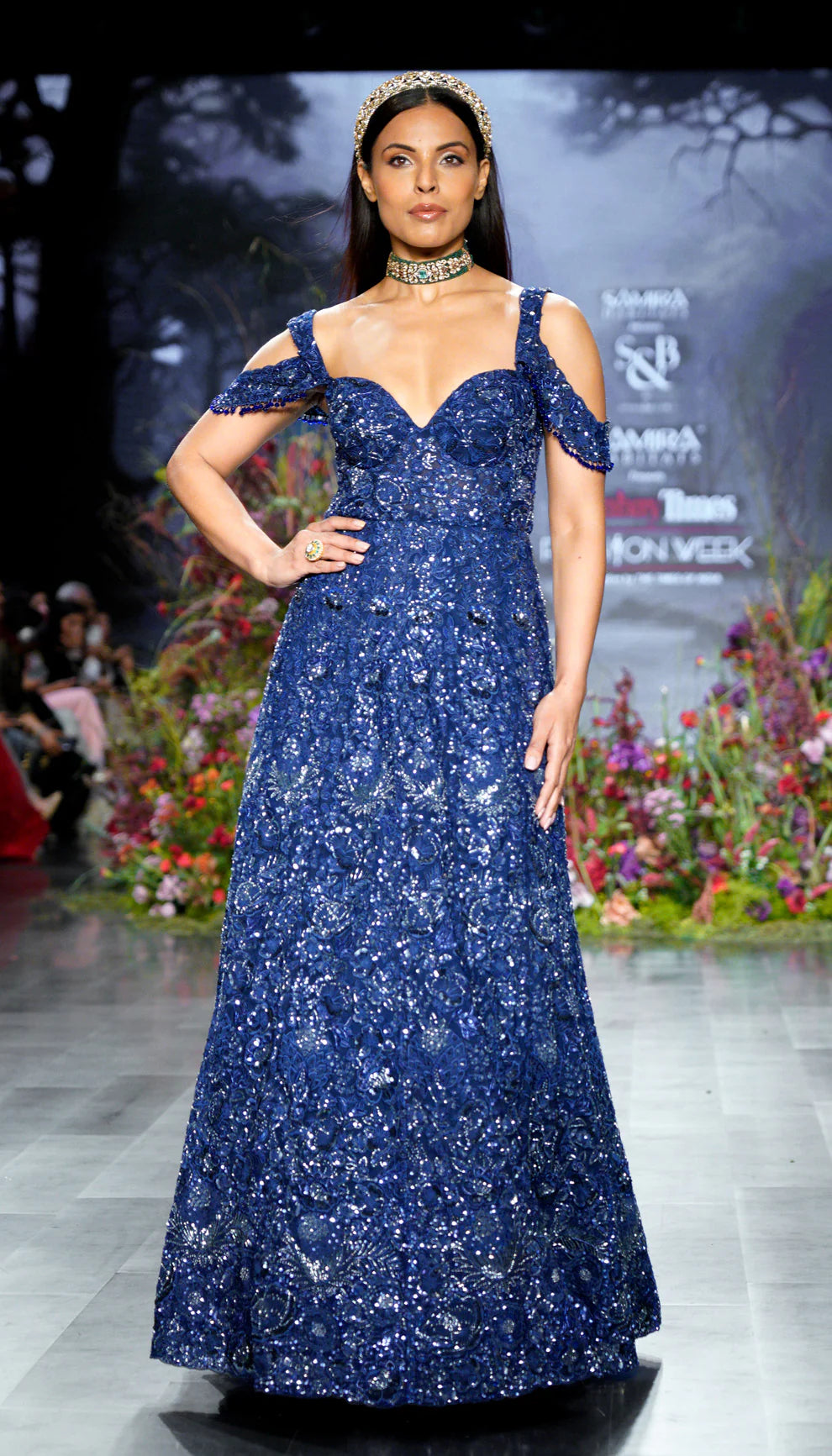 A midnight blue cocktail gown with intricate tone on tone bold floral thread embroidery, highlighted with glass beads, shimmer sequins and crystals.