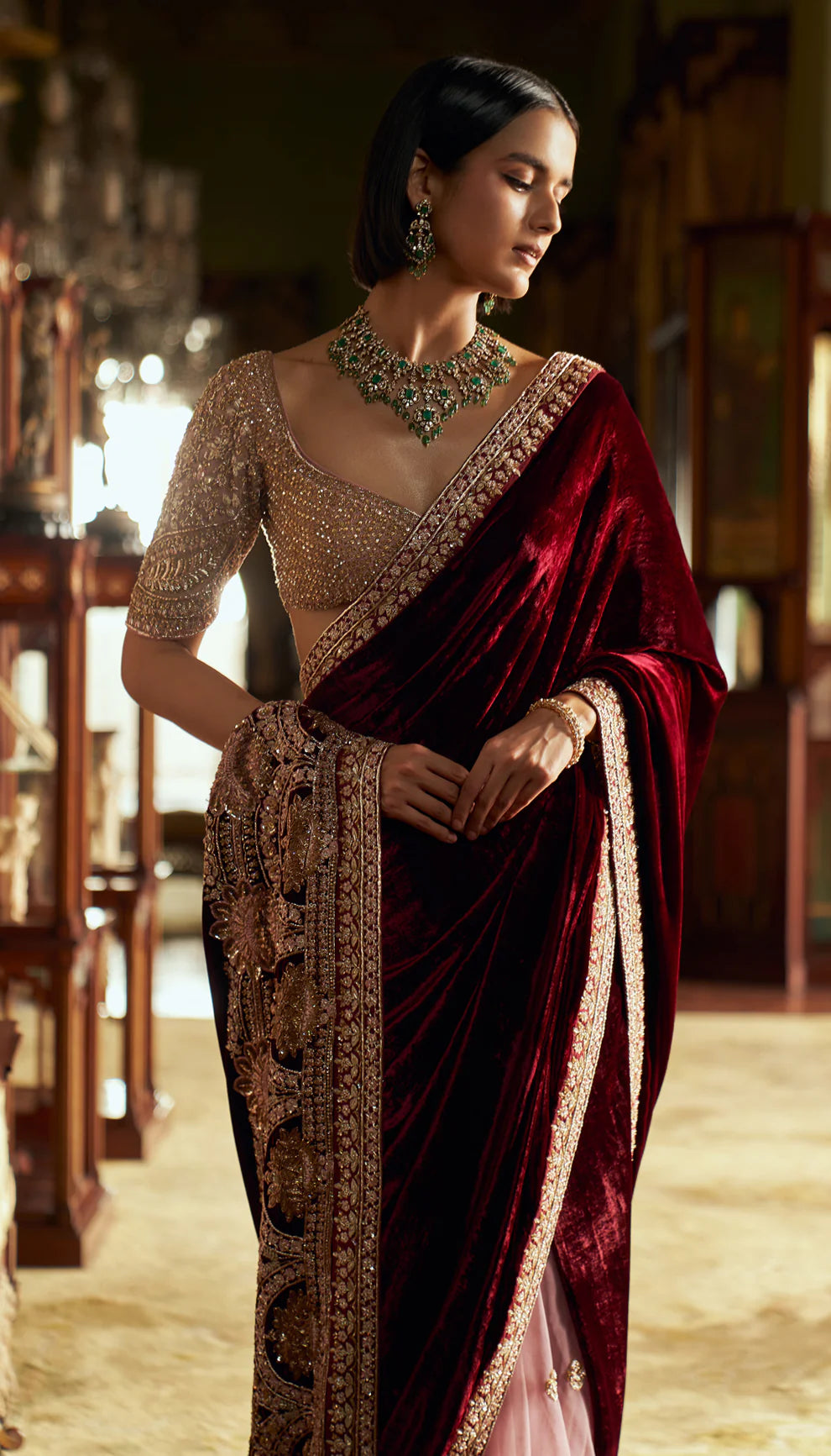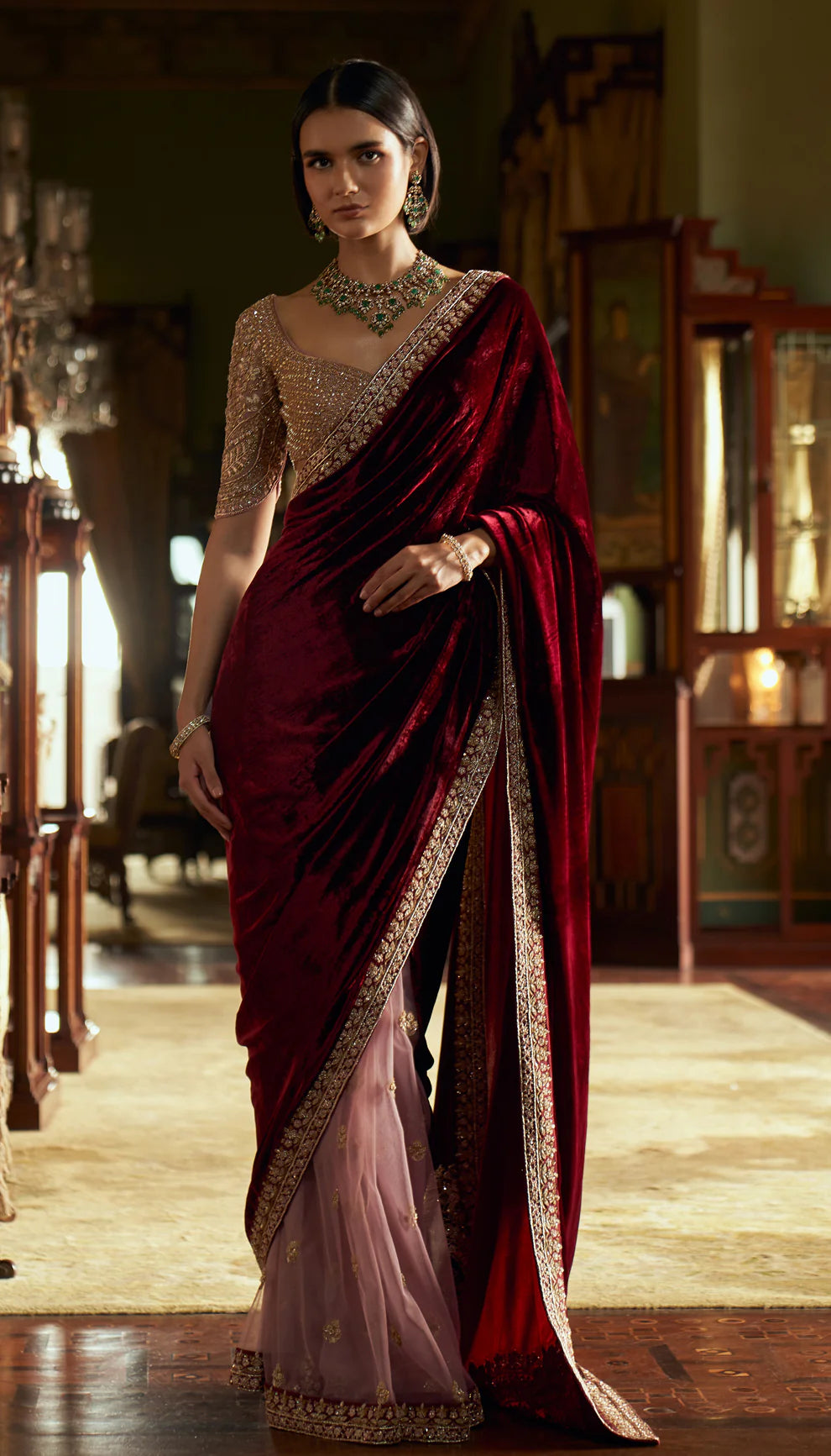 A rich wine velvet sari with an intricate zardozi edged border and pallu with bold lotus motifs. This is teamed with a heavily embellished tulle choli.