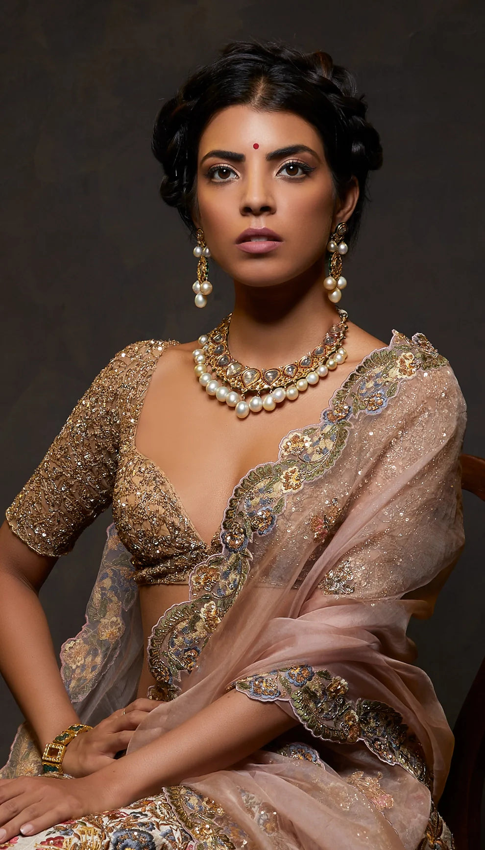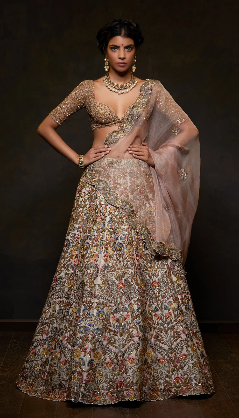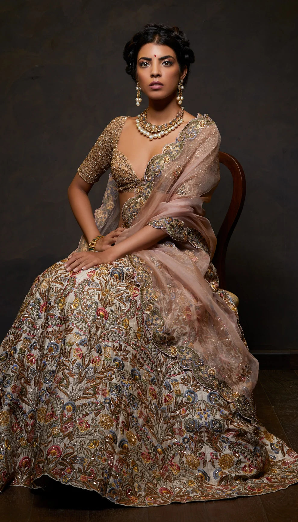 A vintage ivory raw silk lehenga has been embroidered with multicolor thread and is teamed with an old rose pink organza dupatta and an encrusted blouse.