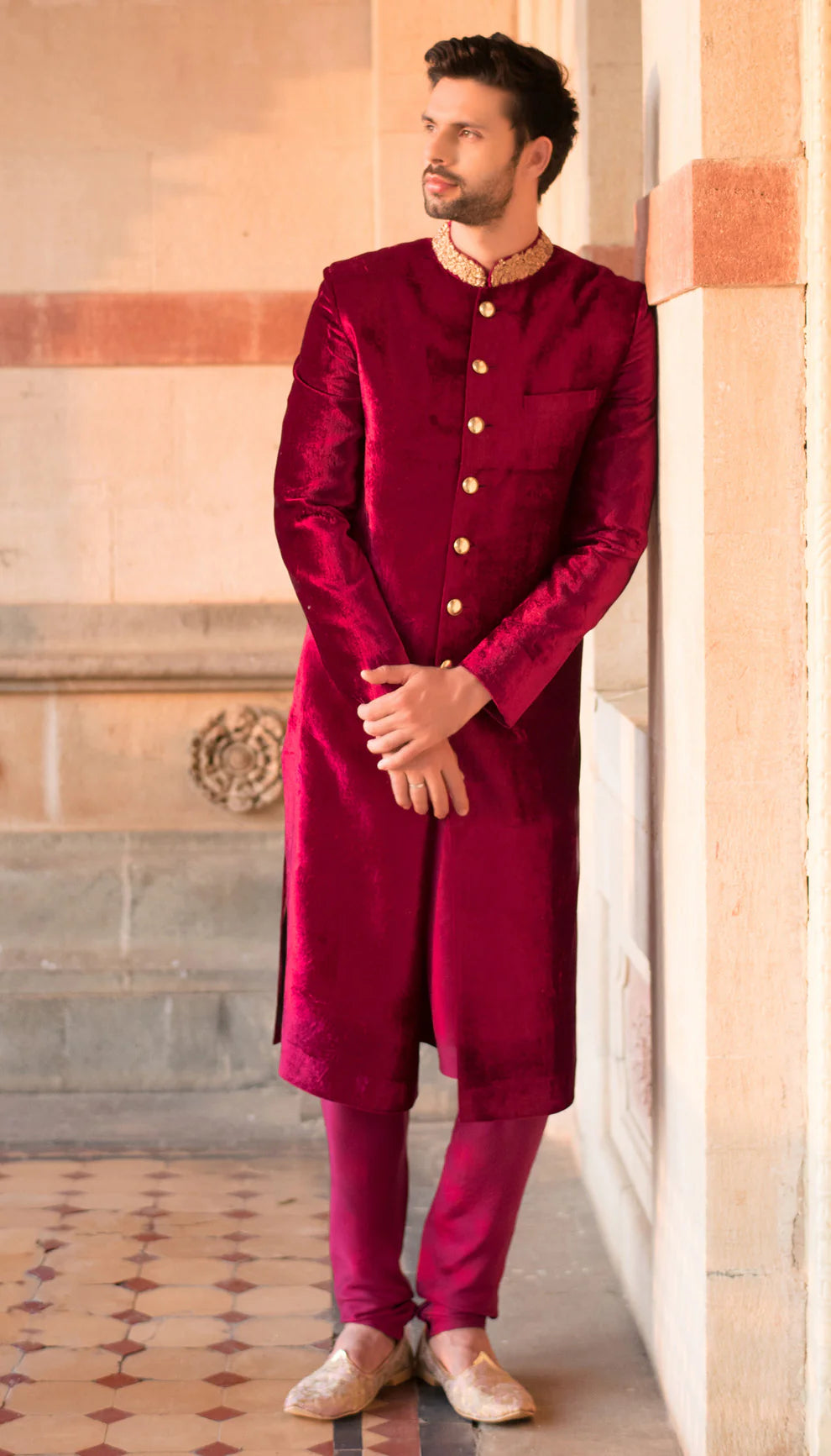 Wine Rose Velvet Sherwani with Signature Shyamal & Bhumika Jeweled Buttons
