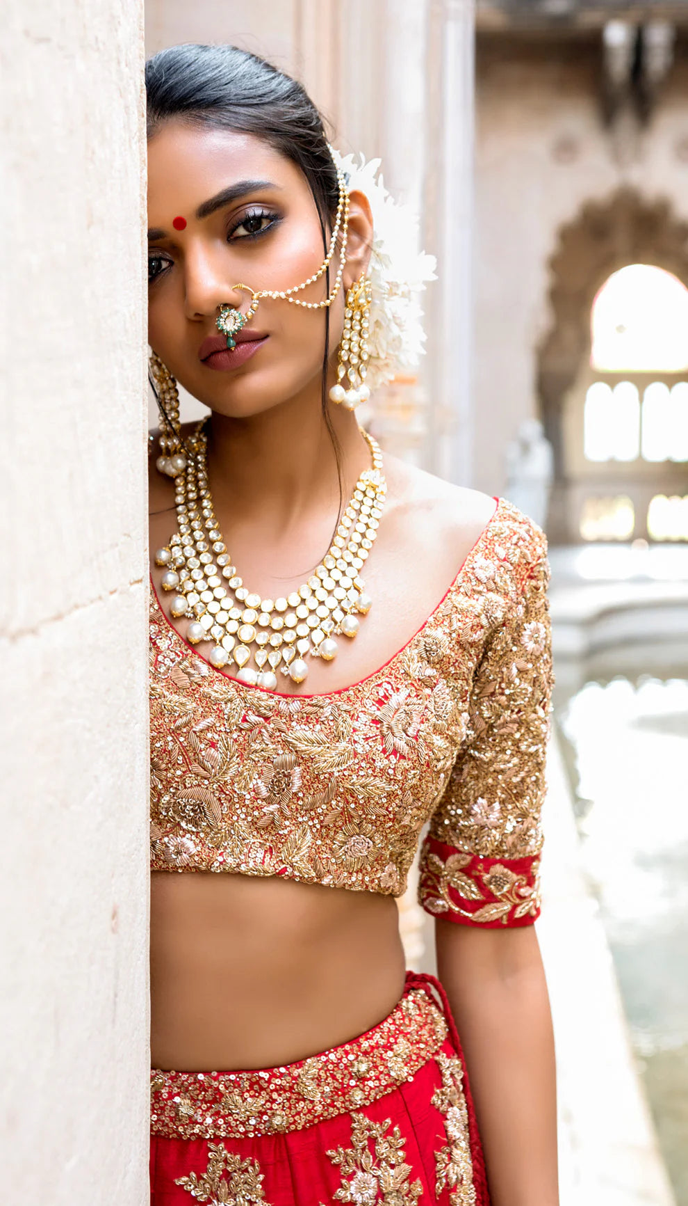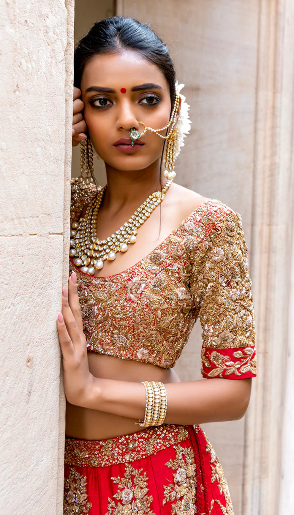 Zameen Tara Lehenga: Sindoor Red with Badla Taar Zardosi & Vintage Rose Bouquets